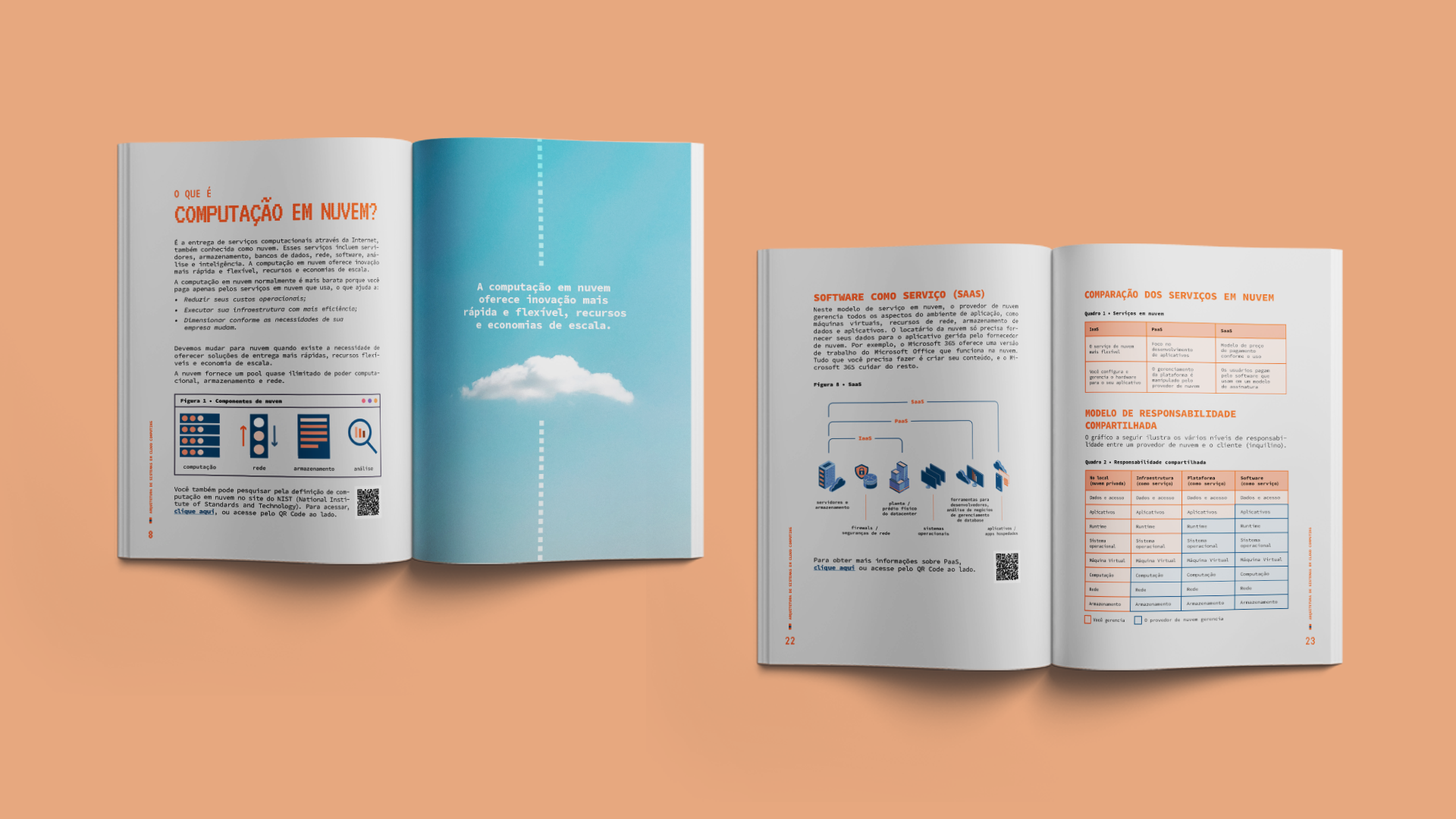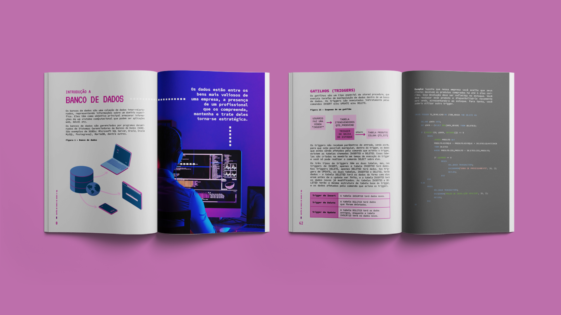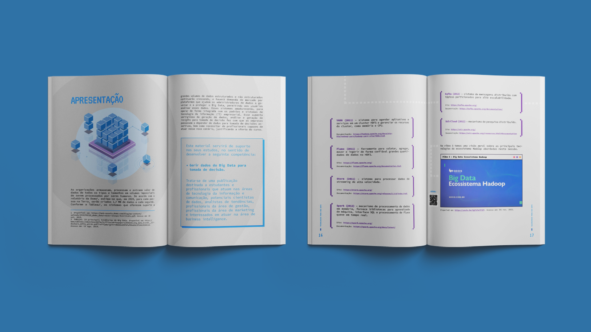 Apostilas digitais para os cursos de programação e desenvolvimento do Senac-RN. Os 5 módulos abordam os seguintes tópicos: Sketchup com V-ray (roxo), Proteção de dados em segurança de redes de computadores (verde), Gestão de banco de dados e SQL (rosa), Tecnologias para Big Data (azul), e Arquitetura de sistemas em cloud computing (laranja).