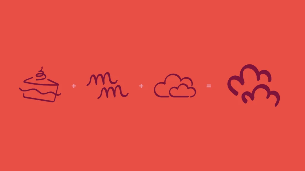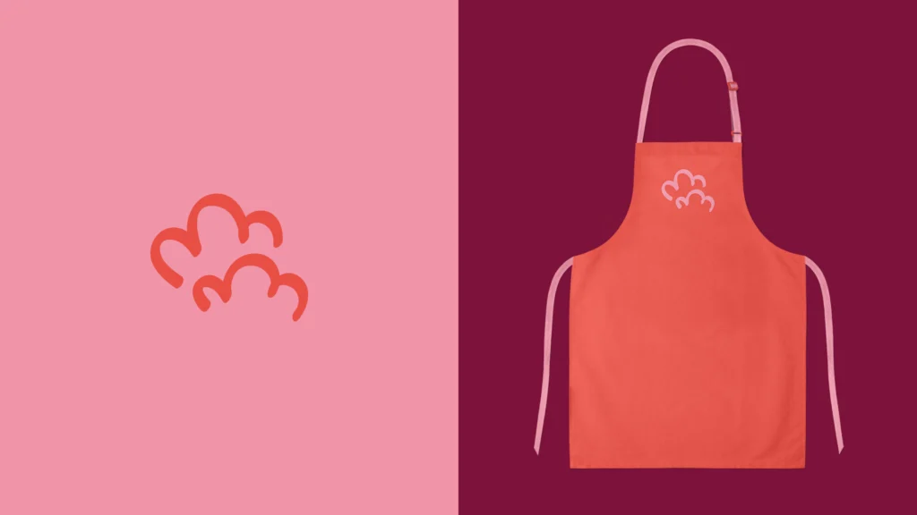 Com esse pensamento que criamos uma marca inspirada em sonhos. O símbolo é a mistura de nuvens (sonhos), as iniciais da marca (MM) e de confeitos de bolo. No mesmo estilo de traço, criamos as ilustrações para a padronagem da marca que mistura todos esses elementos do universo da Mônica (doces, salgados, utensílios, ingredientes e sonhos). A paleta de cores também foi inspirada nas cores dos doces, dando um toque feminino, romântico e alegre à marca, assim como é nossa cliente!